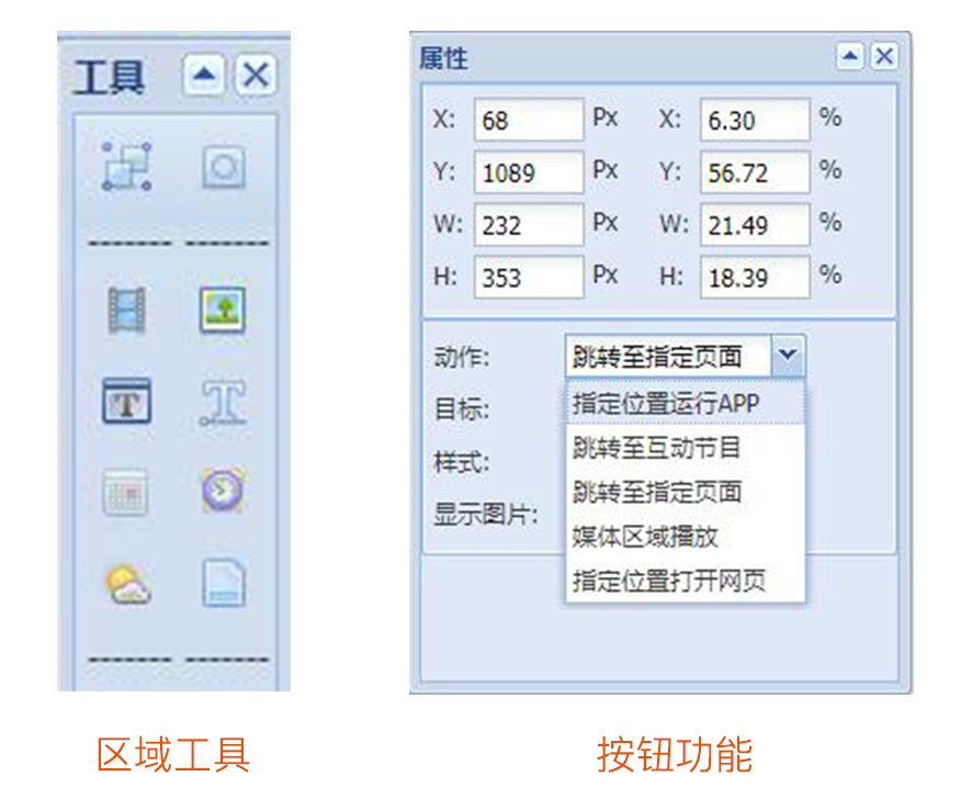 按鈕(組):按鈕主要用于各個項目區域之間的跳轉,主要有:指定位置運行APP、跳轉至互動節目、跳轉至指定頁面、媒體區域播放和指定位置打開網頁。在示例節目中,主要用到了指定位置打開APP和指定位置打開網頁。