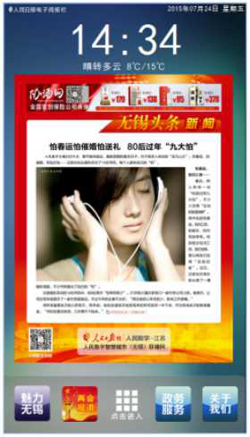 我們以欣威視通的行業解決方案互動節目為例,整個界面中有三個部分:頂欄(logo、時間、日期)、公司介紹和互動入口。這邊的每一個互動入口都可以點擊進入到詳細的互動界面。